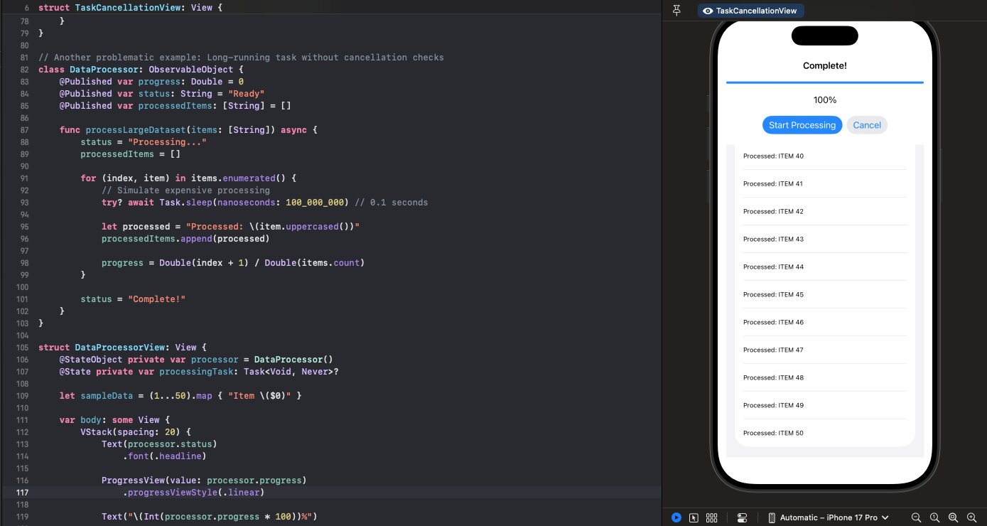 Now when Cancel is tapped, the next loop iteration sees Task.isCancelled is true and exits.